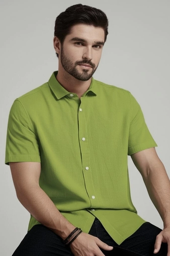 Camisa manga corta con cuello italiano, confeccionada en lino.
